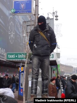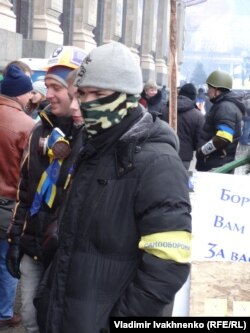 Активист "Тризуба" Василий Лабийчук, согласившийся побеседовать со мной, лицо не прячет за маской, поскольку, как говорит, уже ничего не боится. Ему – 24, приехал на Майдан из Тернополя. В "секторе националистов" расположились члены всеукраинской организации "Тризуб", киевской организации "Белый молот", "Патриот", УНА-УНСО. Их задача – круглосуточная охрана порядка в лагере и укрепление баррикад. Днем проводят тренировки в одной из армейских палаток. Спят прямо в коридоре, кабинеты не занимают. На полу, рядом с матрасами – железные и пластмассовые каски, противогазы, наколенники, налокотники, самодельные щиты для защиты туловища. Наибольшее число обитателей 5-го этажа – жители Западной Украины и Киева, но есть представители Херсона, Одессы и Крыма. 11 декабря, во время попытки милицейского спецназа освободить Майдан от манифестантов, отряды националистических организаций взяли на себя охрану всего Дома профсоюзов, а когда атака была отбита – направились помогать на баррикады. Общая численность отрядов самообороны на Майдане – около пяти тысяч добровольцев, в том числе это бывшие военные и ветераны-афганцы. Из них более трехсот человек – из праворадикального сектора. Василий Лабийчук на Майдане с первых дней. Дома его ждут жена и дочь, он собирается вернуться к ним только после победы. Активист "Тризуба" уверен, что происходящее в стране – это уже не протесты против власти, а "конфликт с оккупантами".