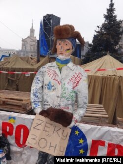 Главным злом для Украины обитатели Майдана называют Виктора Януковича. Чучело с надписью: "Зеку – зону" установили недалеко от входа в Дом профсоюзов.