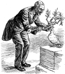 Вильсон – голубю мира: "Вот тебе оливковая ветвь. Принимайся за дело". Голубь: "Конечно, я хочу угодить всем. Но не слишком ли она тяжела для меня?" Надпись на ветви: "Лига Наций". Карикатура из британского журнала Punch, март 1919 года. Сенат отказался ратифицировать Версальский договор. США так и не вступили в Лигу Наций