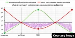На графике видно, что в среднем человек наиболее полезен системе в возрасте от 15 до 65 лет, когда он может создавать добавленную стоимость и выплачивать налоги государству. В указанный период человек наименее подвержен риску заболеть, то есть нет необходимости социального обеспечения его со стороны государства за исключением минимальной страховой защиты. Потому социалка, как правило, нужна только до школьного лет и в пожилом, пенсионном возрасте, особенно медицинское обслуживание.