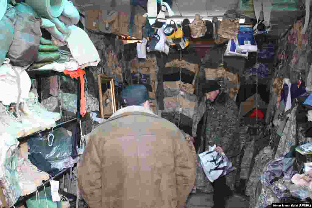 Здесь можно купить военную униформу американских, российских, германских, турецких и китайских военнослужащих. Сюда часто заглядывают любители стиля "милитари", охотники и рыбаки, которым по душе добротная, недорогая военная одежда и обувь. "Азаттык", Кыргызская служба РСЕ\РС